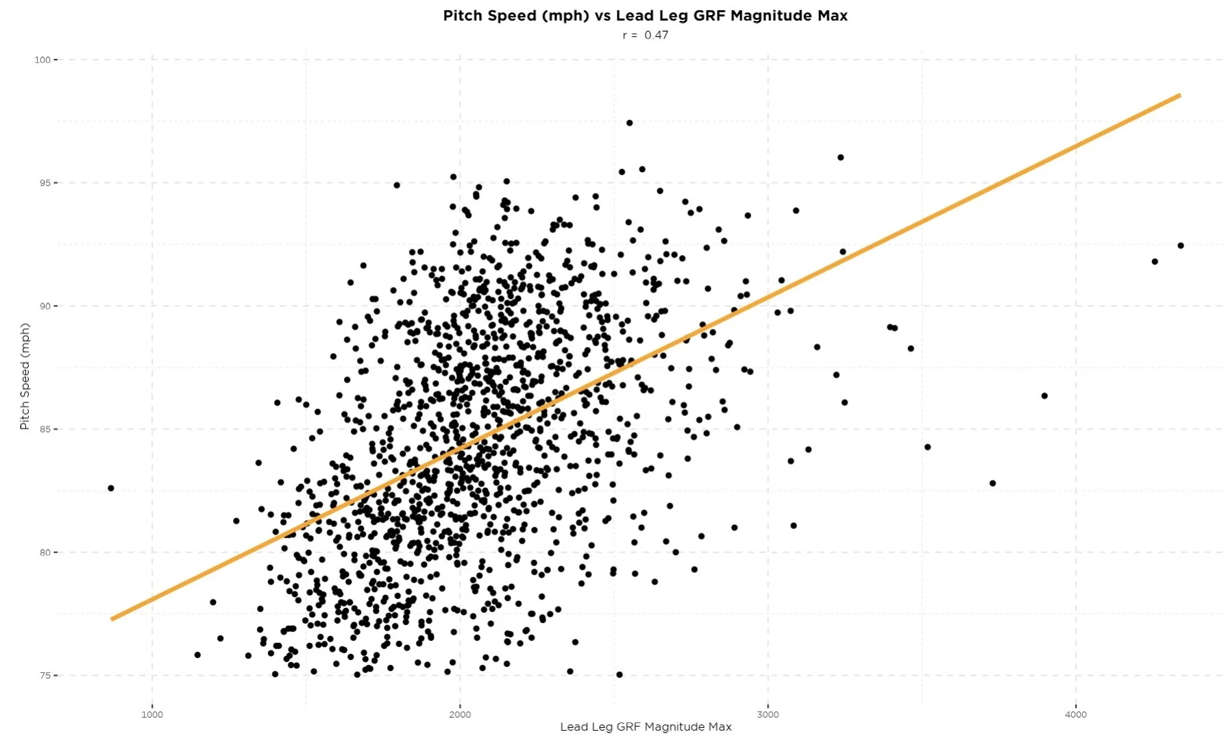 Its also important! Lead Leg GRF Magnitude in the pitching delivery is a moderately positive correlator to pitch speed. The graph below shows the relationship between Lead Leg GRF and Pitch Speed in a dataset of college and professional pitchers.