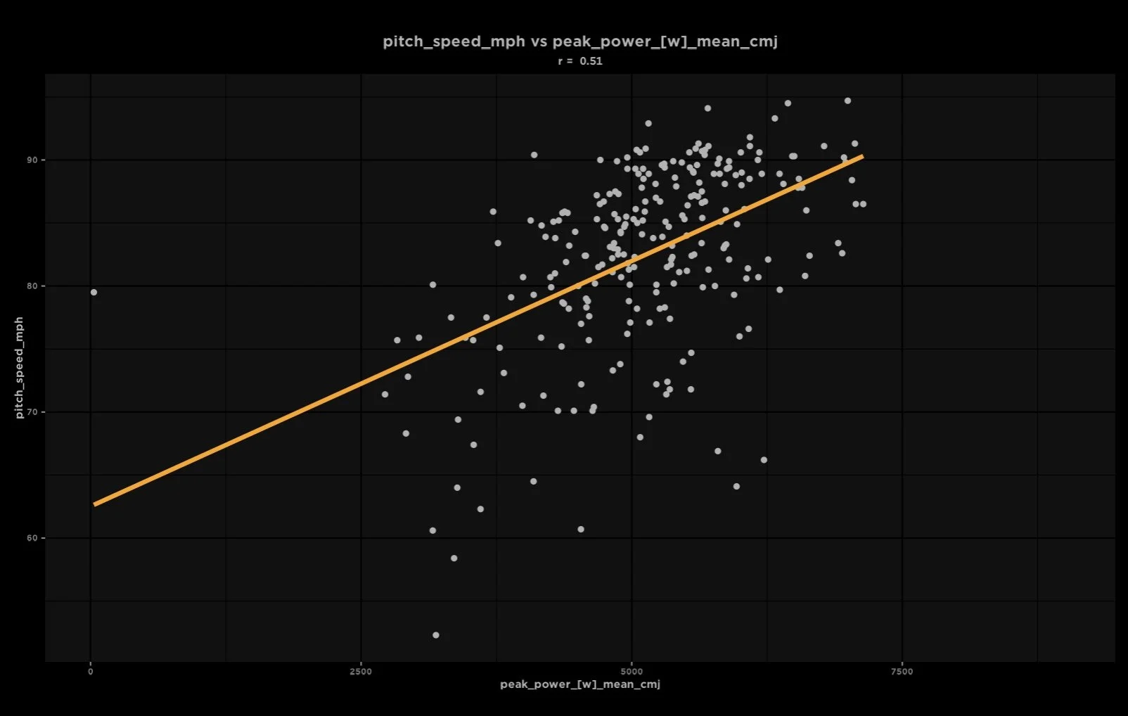 It’s important! Countermovement Jump (CMJ) Peak Power is a moderately positive correlator to pitch speed (CMJ and Squat Jump Peak Power are our highest general force plate output correlators to pitch speed!). Here’s a graph of the relationship between CMJ Peak Power and Pitch Speed in a dataset of college and professional pitchers.
